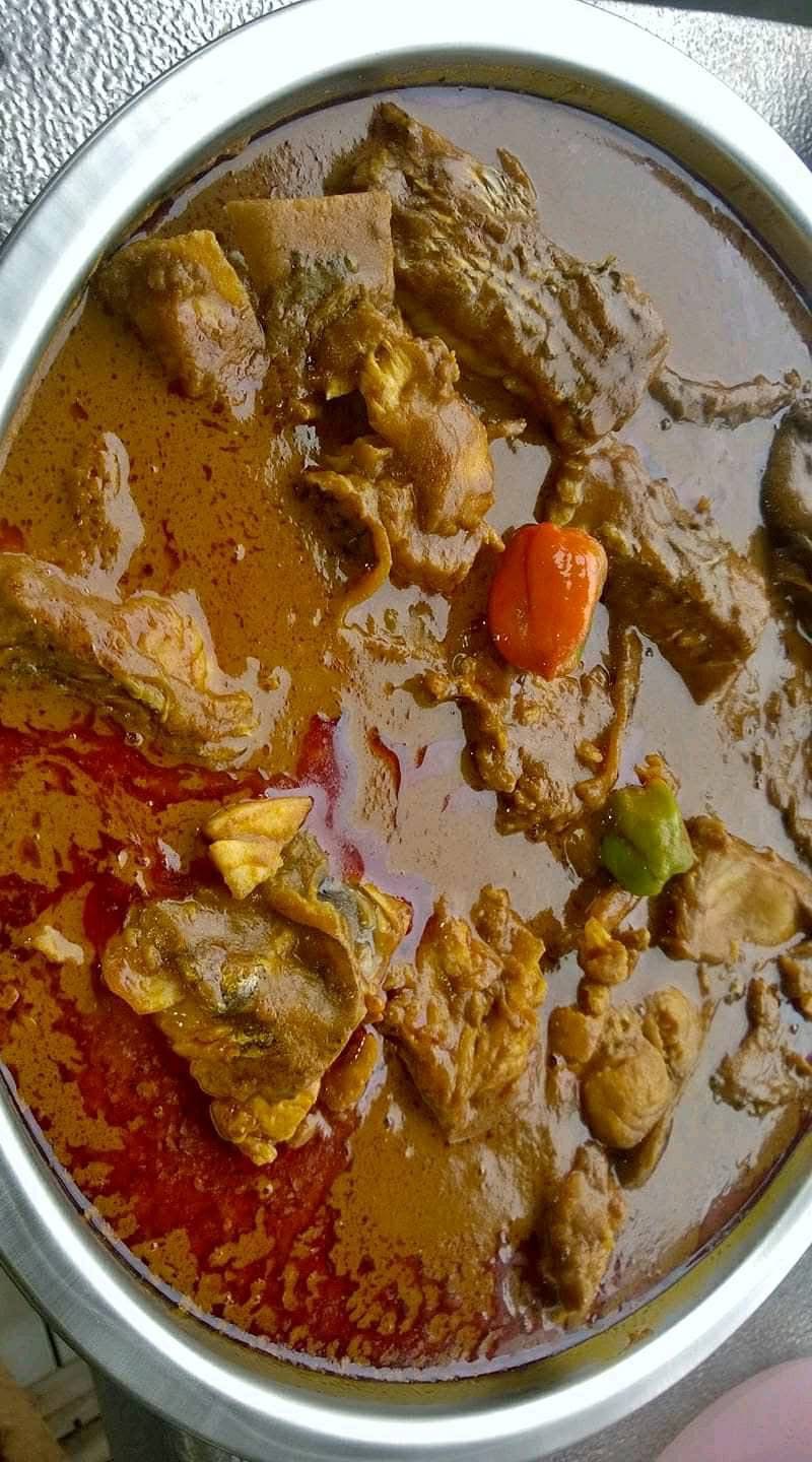 Koku mu teri – coq à la courge, un coq mature mijoté doucement dans une sauce aux graines de courge (éni), ail sauvage, oignons et piment. Une sauce épaisse et veloutée, accompagnée de manioc ou de plantains bouillis.